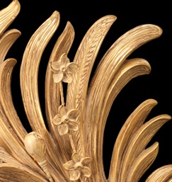 An imposing giltwood and gesso decorated convex mirror with egg-and-dart moulding surrounded by boldly carved acanthus leaves tied with a ribbon.