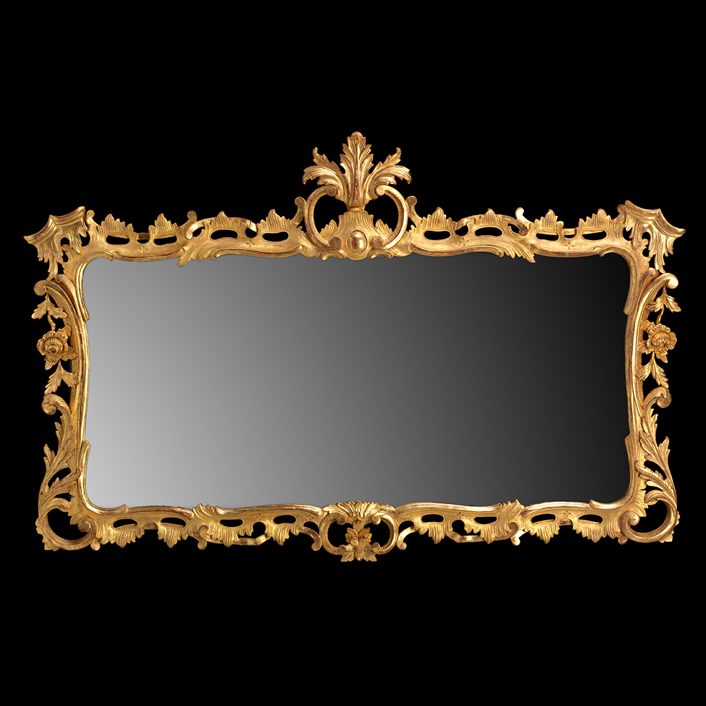 A Chippendale carved gilt-wood overmantel mirror in the Rococo style, with ‘c’ scrolls, acanthus, cabuchon and leaf spray cresting.