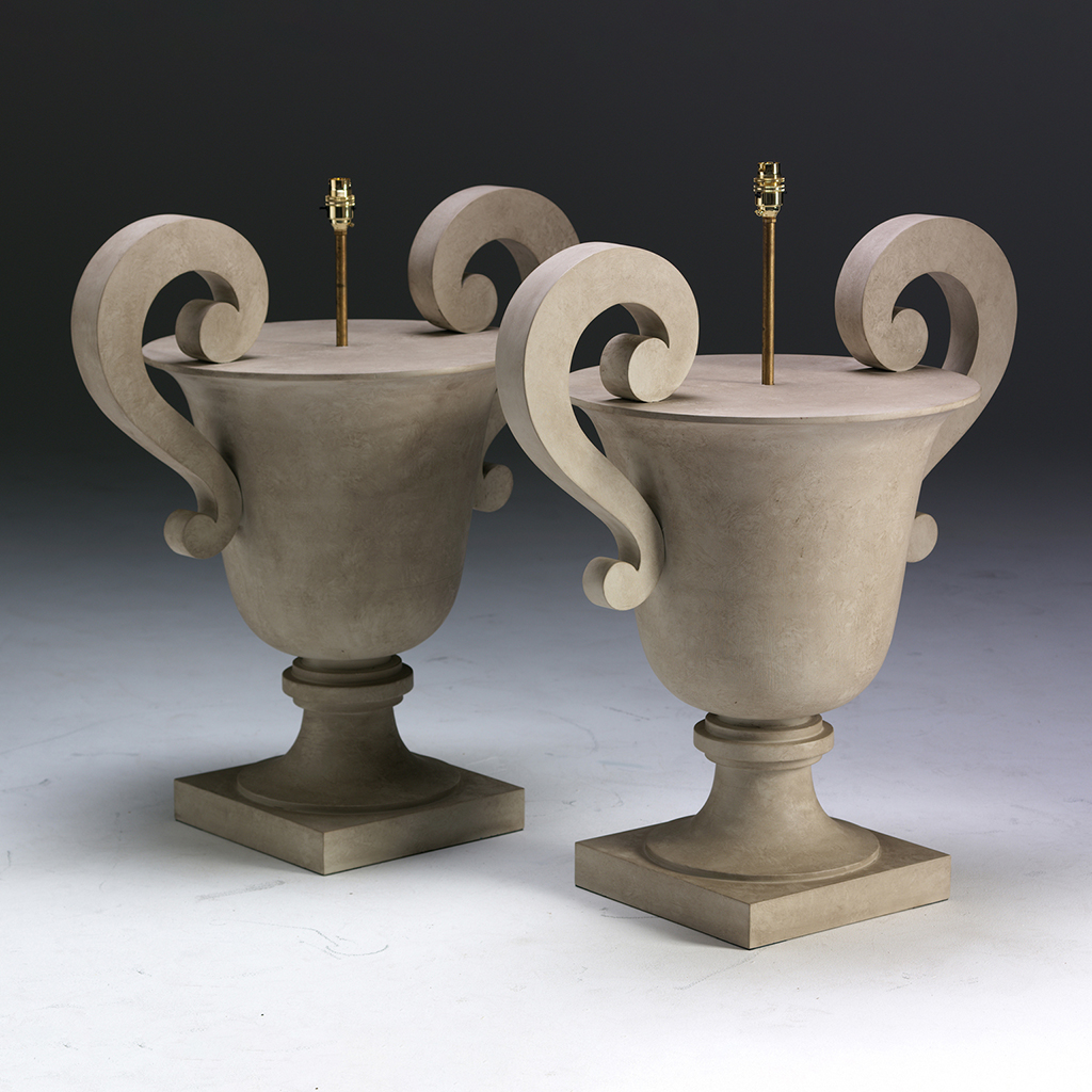 A large turned wood Neo-classical table lamp with over sized S scroll handles.