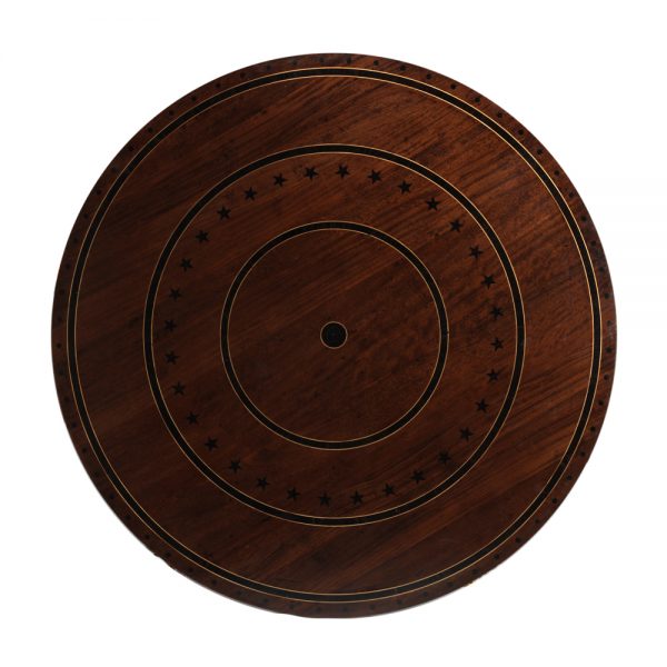 A circular dining table of large proportions in the style of Thomas Hope. The table, which is constructed entirely from early 19th Century timbers, was commissioned for a country house in Devon. The 1908 mm/72” diameter table top has inlaid ebony stars and brass lines and the edge is inset with a brass band and paterae. The base is of pyramidal form and rests upon Regency Grand Tour inspired winged claw feet. Finished in aged polish.