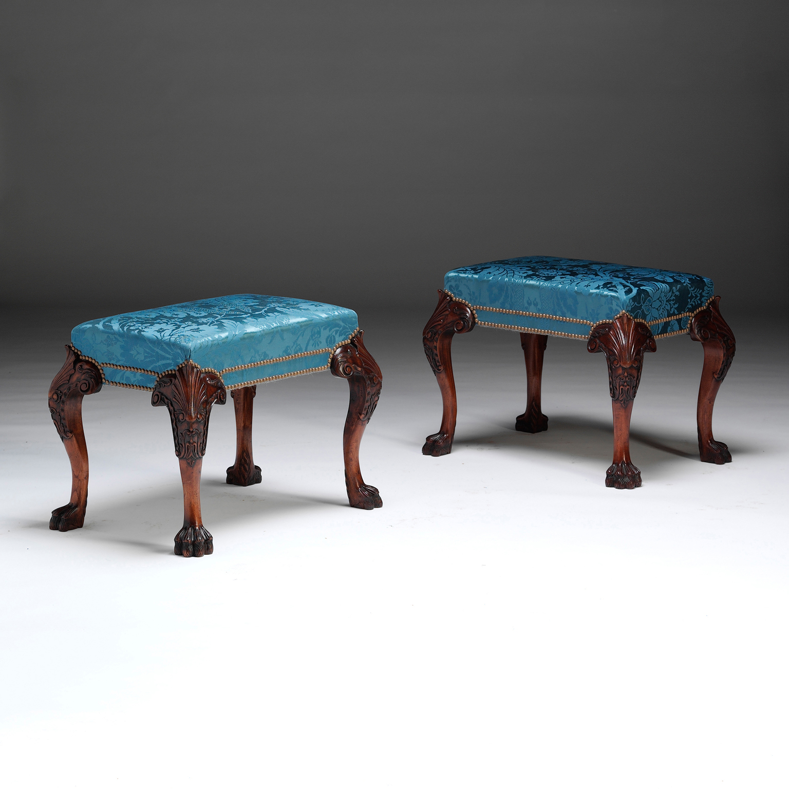 A carved mahogany, upholstered stool in the mid Georgian manner with shell carved knees, acanthus decoration and hairy paw feet.