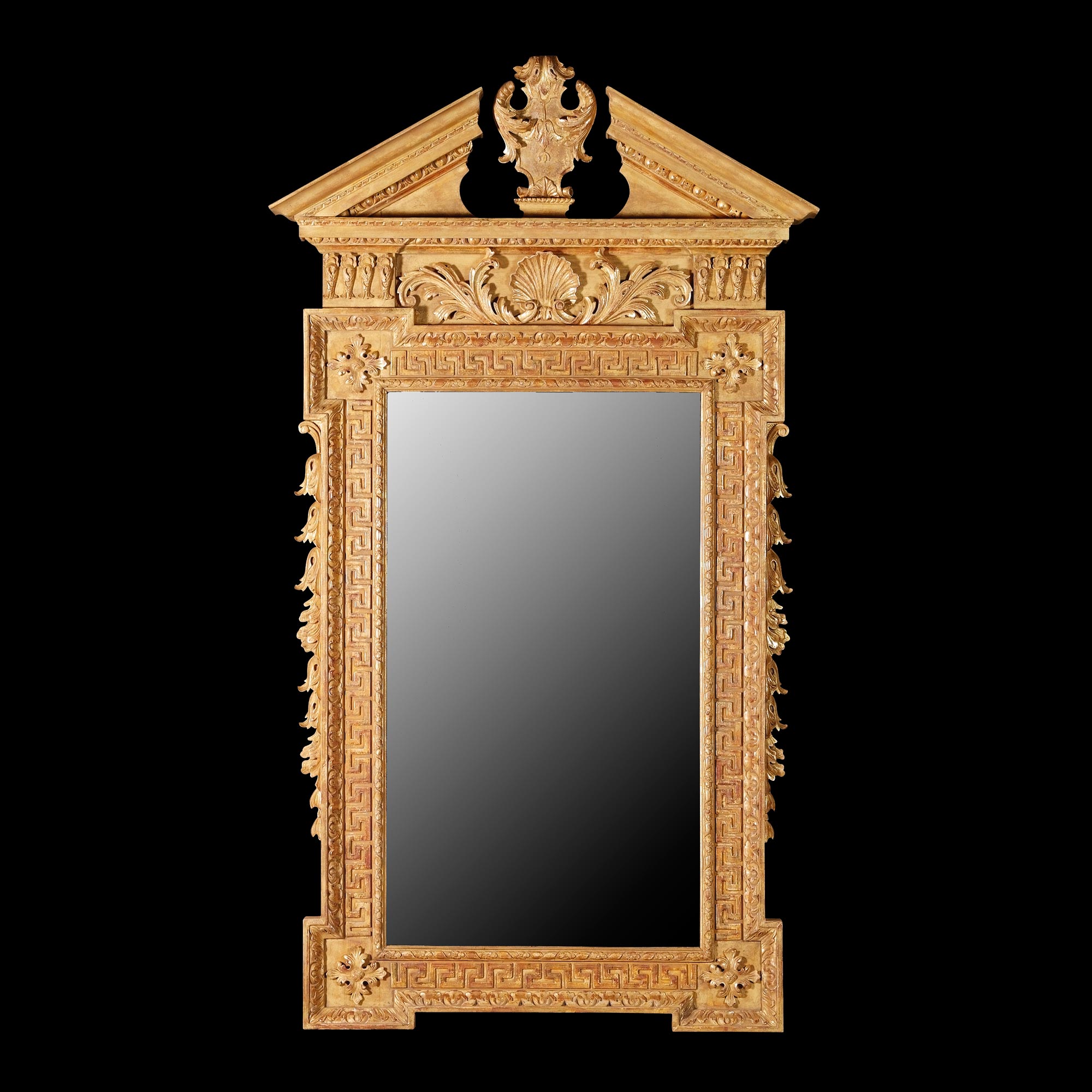A carved and gilt-wood mirror in the manner of William Kent and the Palladian style. The rectangular looking glass within a compound moulded frame has outset corners, flanked by trailing bell-flowers, decorated with Greek key pattern, blind fretwork and with leaf carved paterae at each corner. The architectural broken pediment is carved with egg-and-dart mouldings centred by an acanthus leaf wrapped cartouche.