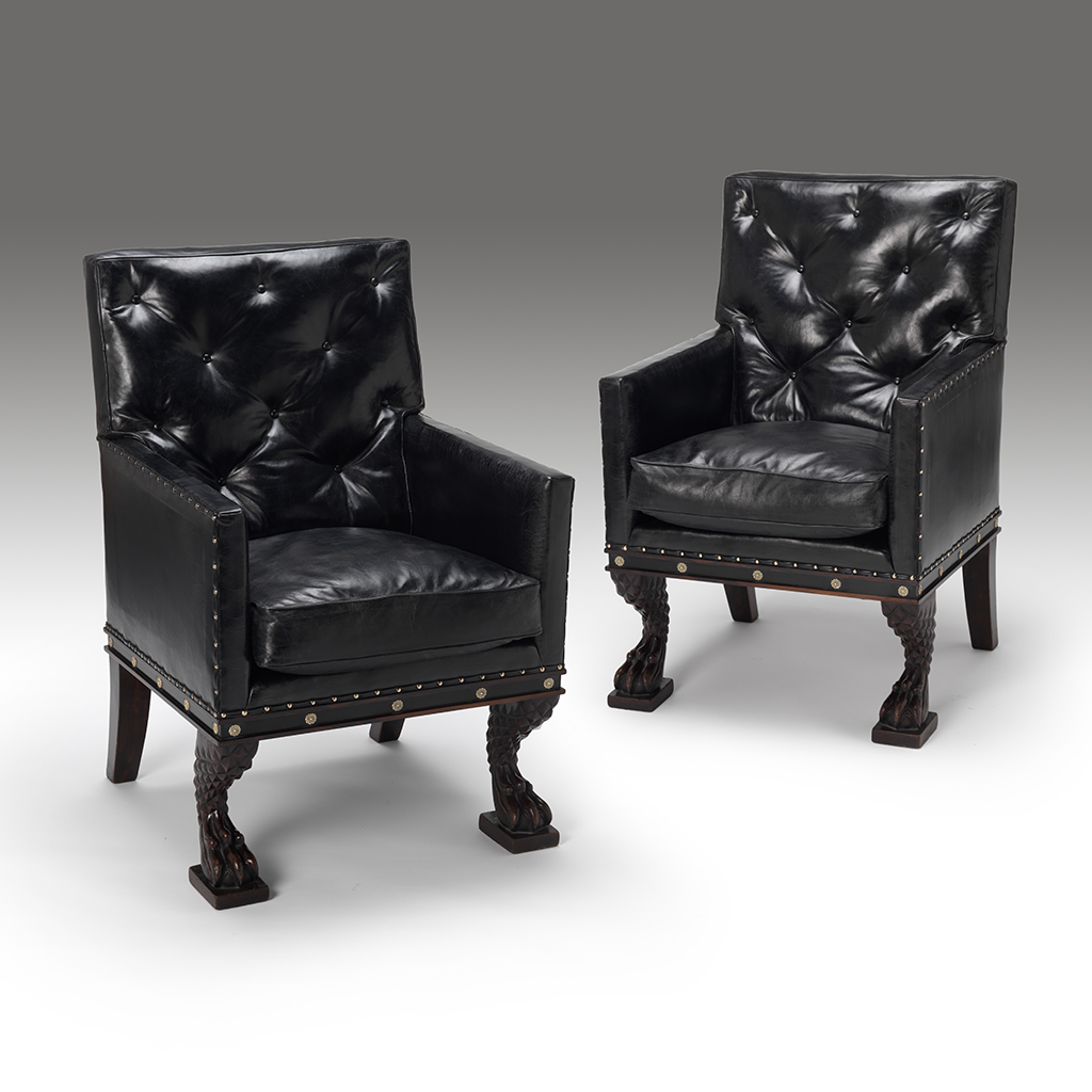 A carved mahogany library armchair inspired by furniture from Brighton Pavilion, with stylised crocodile. To be finished in the clients own material.
