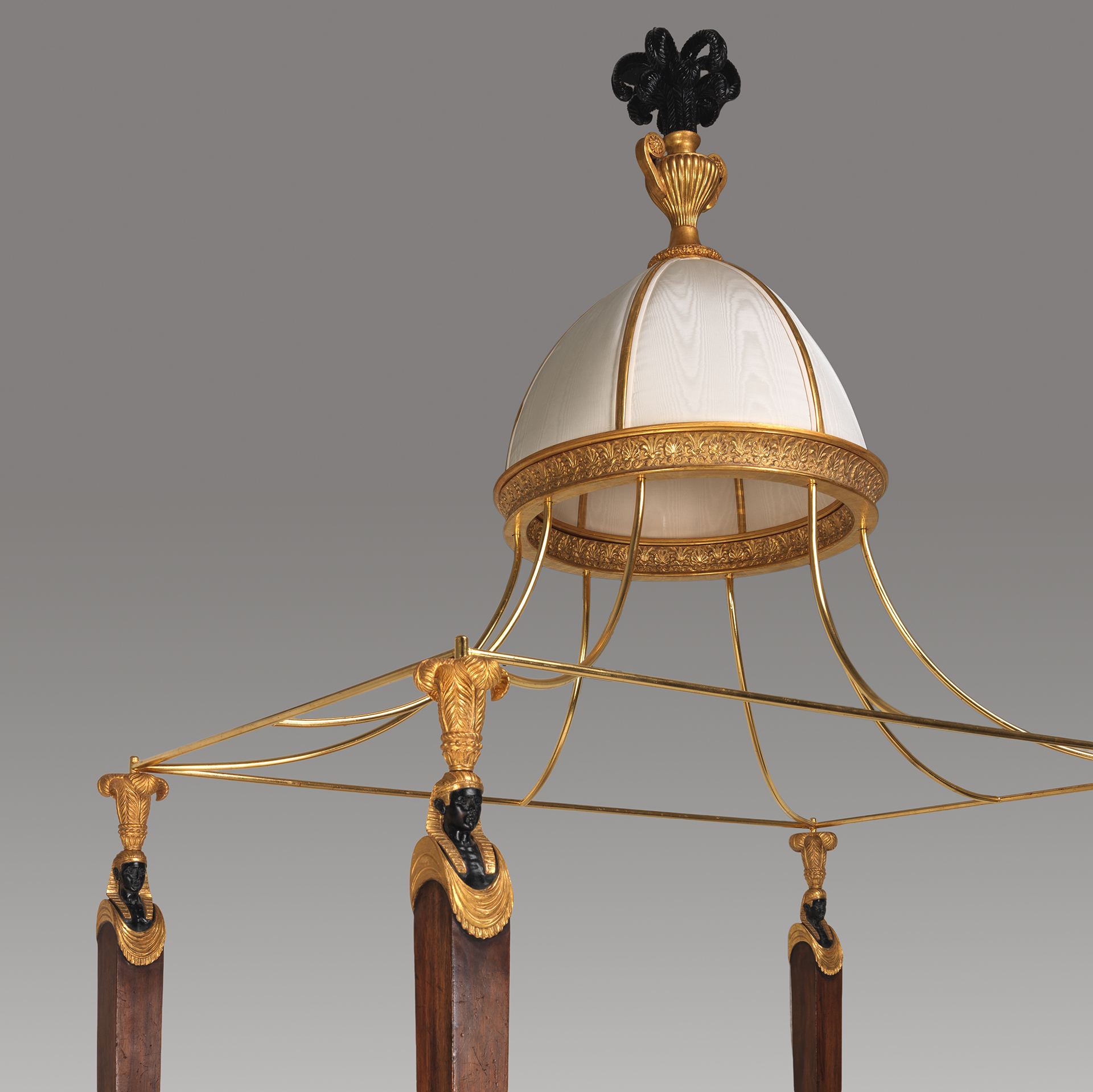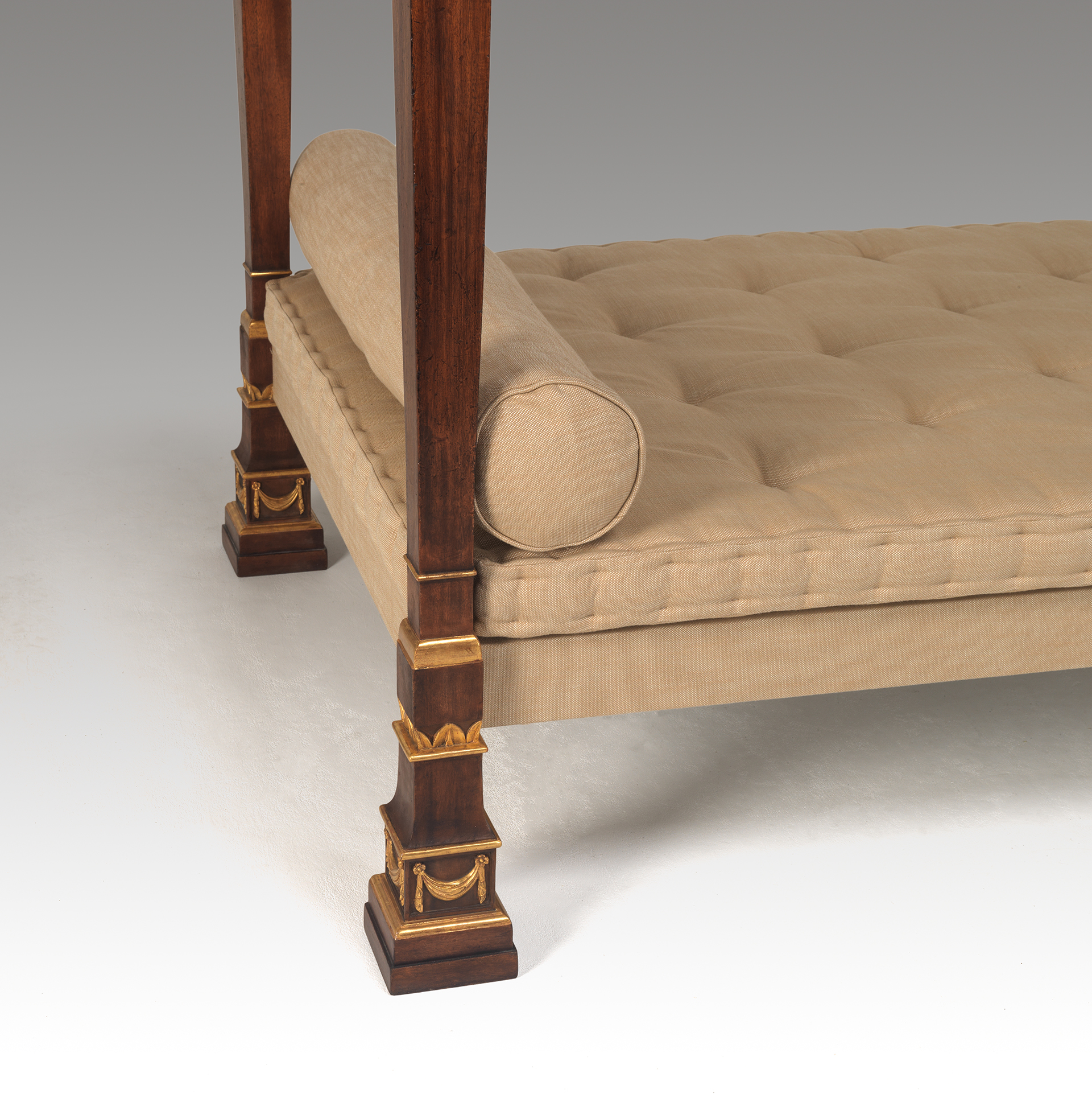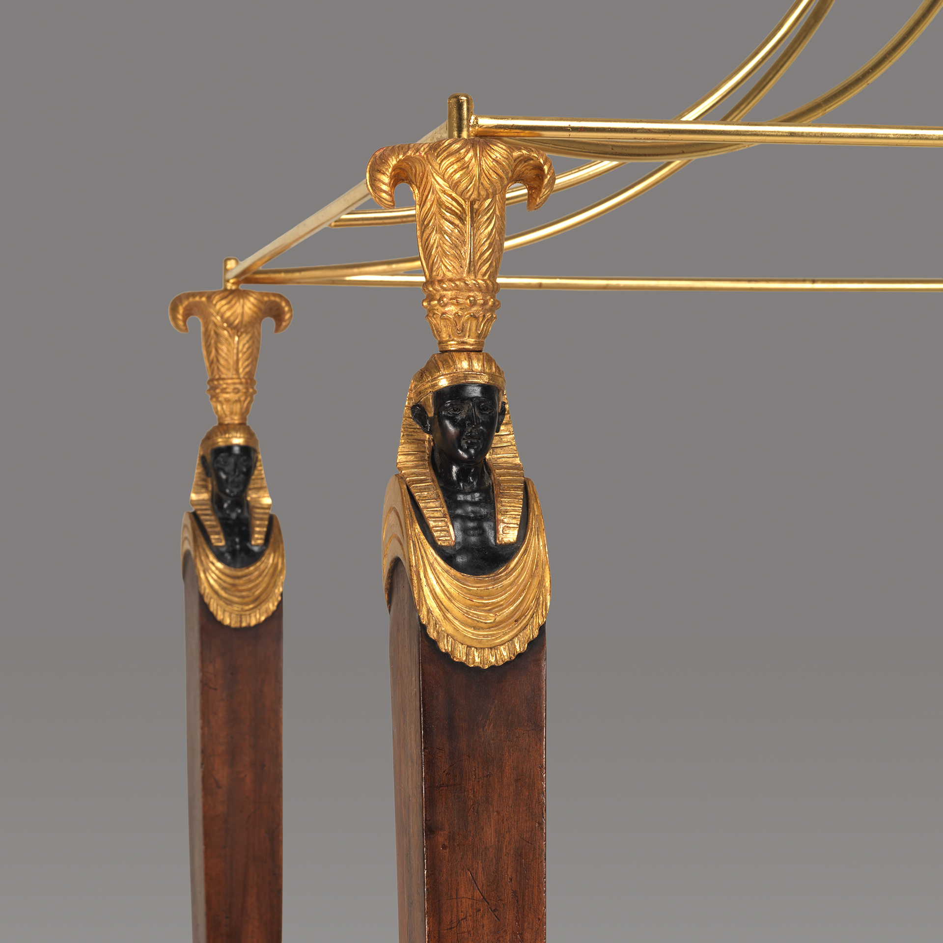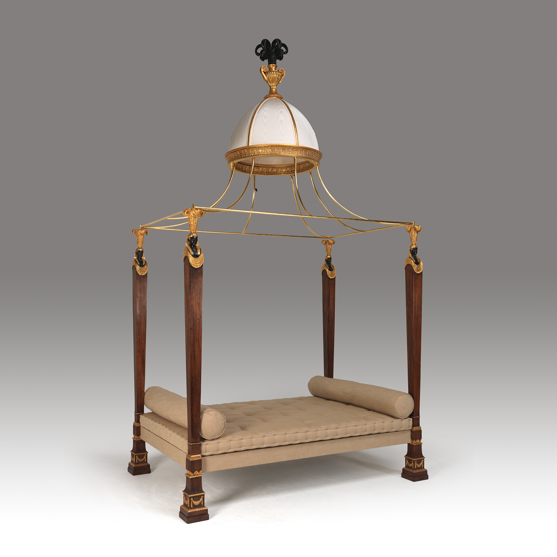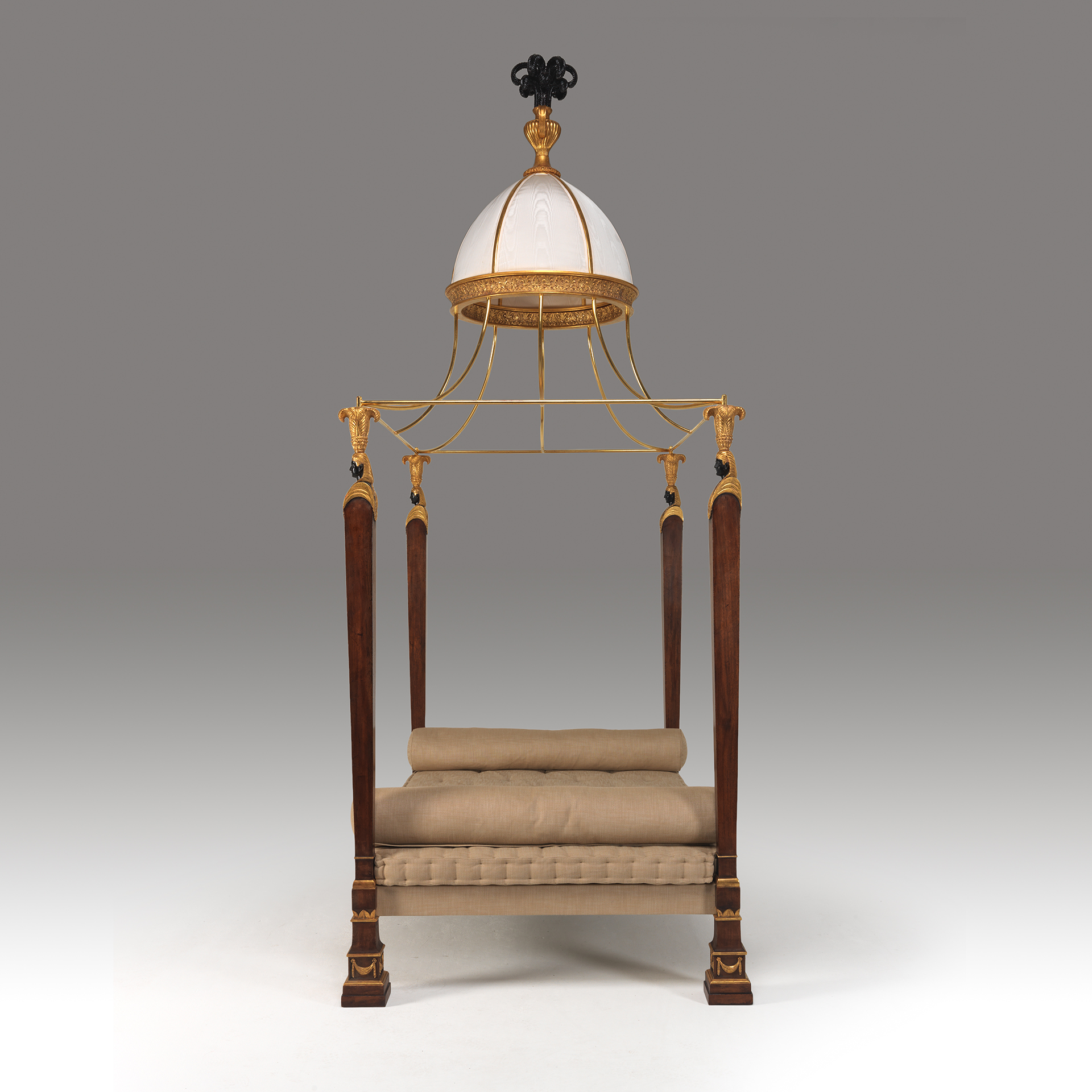A finely carved mahogany and water gilded grand tour Egyptian inspired Lit A La Polonaise. A finely carved urn with decorative ostrich plumes resting upon the canopy.
