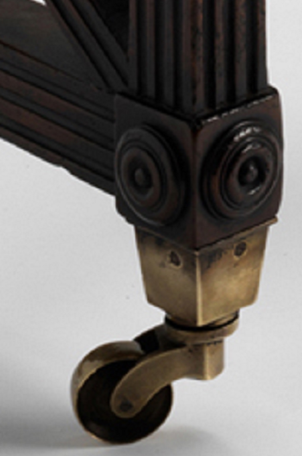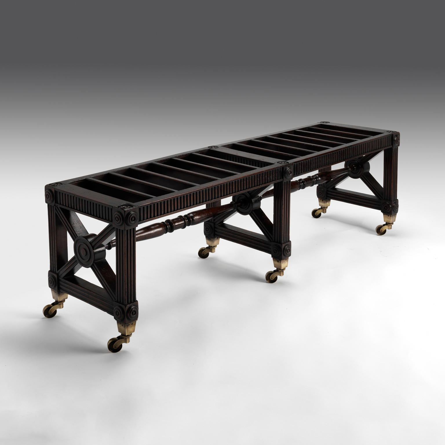 A fine Hope crossover slatted bench with reeded legs, paterae and turned stretchers. The legs terminating in brass castors.