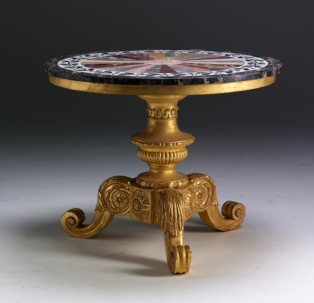 An early 19th Century design carved and gilded centre table with an inlaid specimen marble top. The top is inset with numerous radiating panels of specimen marbles within a broad floral band and portoro marble banding. The turned and reeded stem with carved collars, is raised on a scrolling tripod base decorated with acanthus leaf scrolls and paterae.