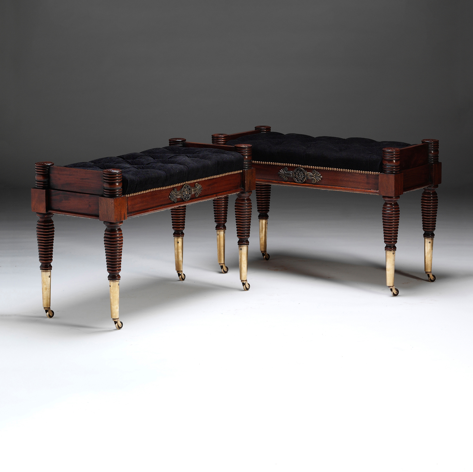 A Regency turned mahogany and brass mounted window seat on elongated brass castors. To be upholstered in the clients own material.
