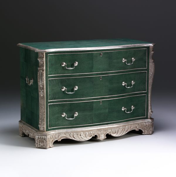 An important Chippendale inspired carved and silver gilt serpentine shagreen veneered commode, with silvered handles and escutcheons, taking its inspiration from the design of the mid 18th century.