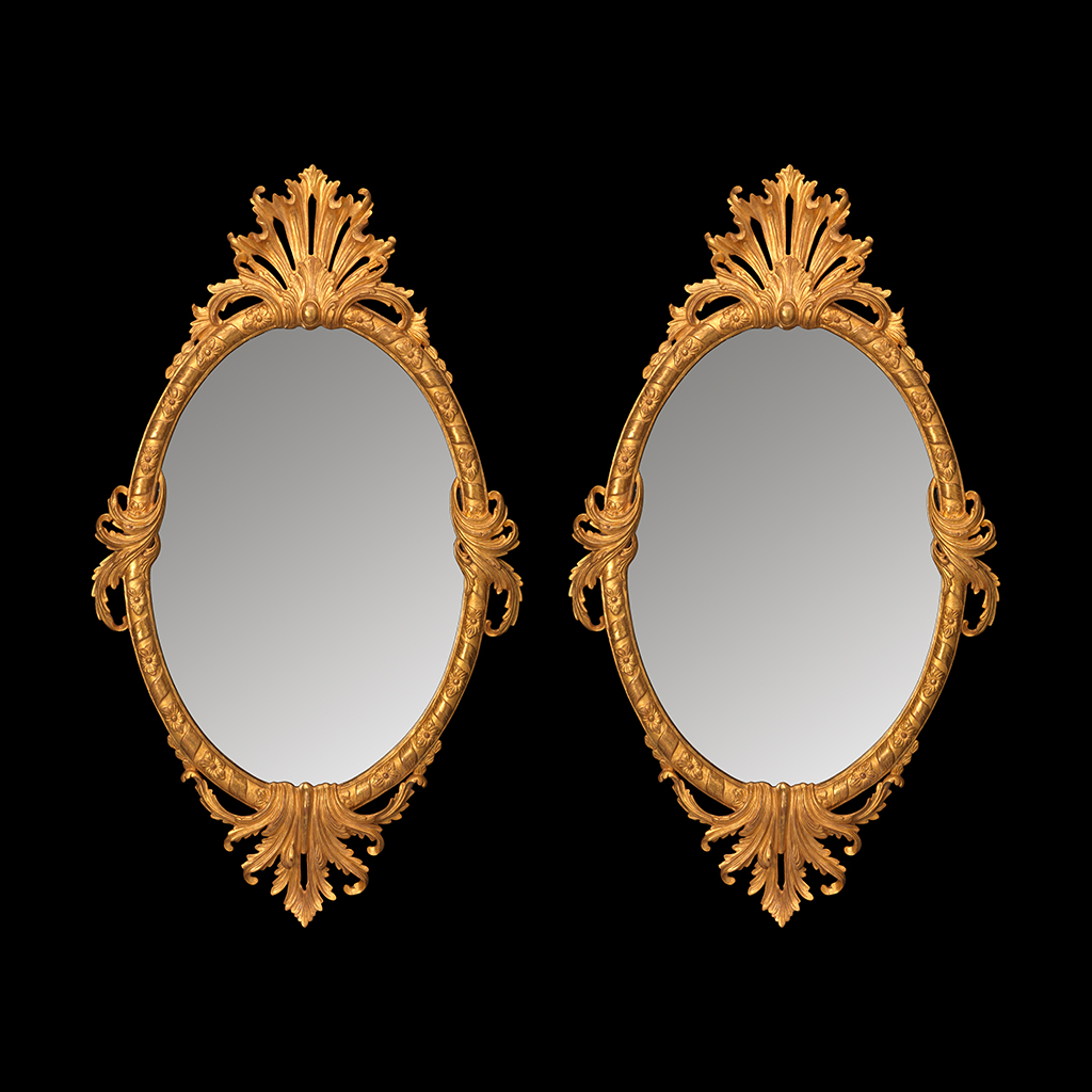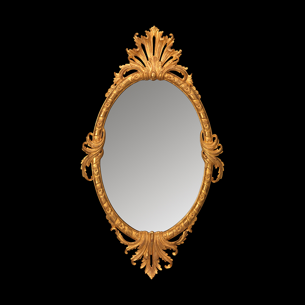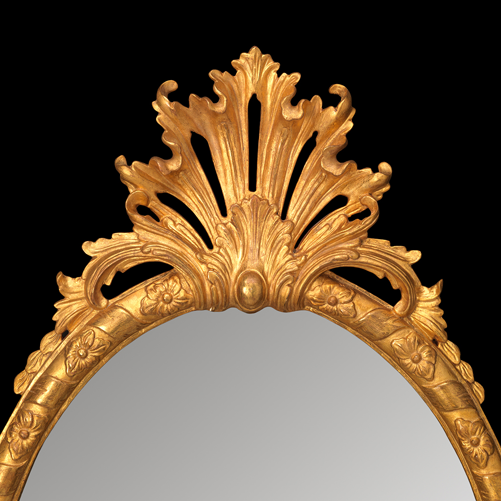 A fine George II giltwood oval mirror with fine acanthus leaf carvings wrapped around the sides, top and bottom.