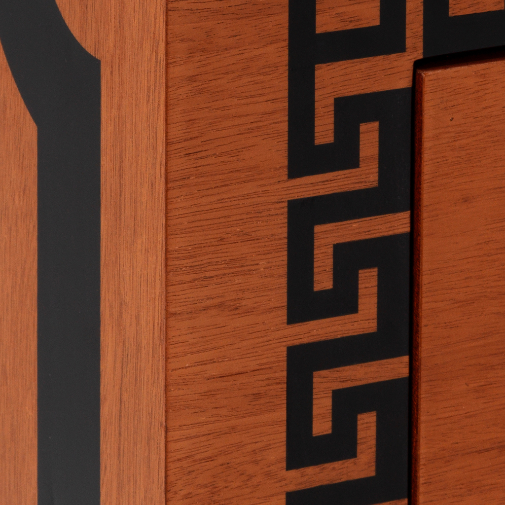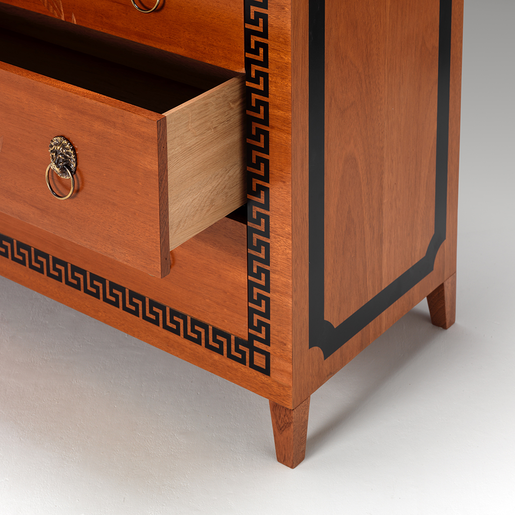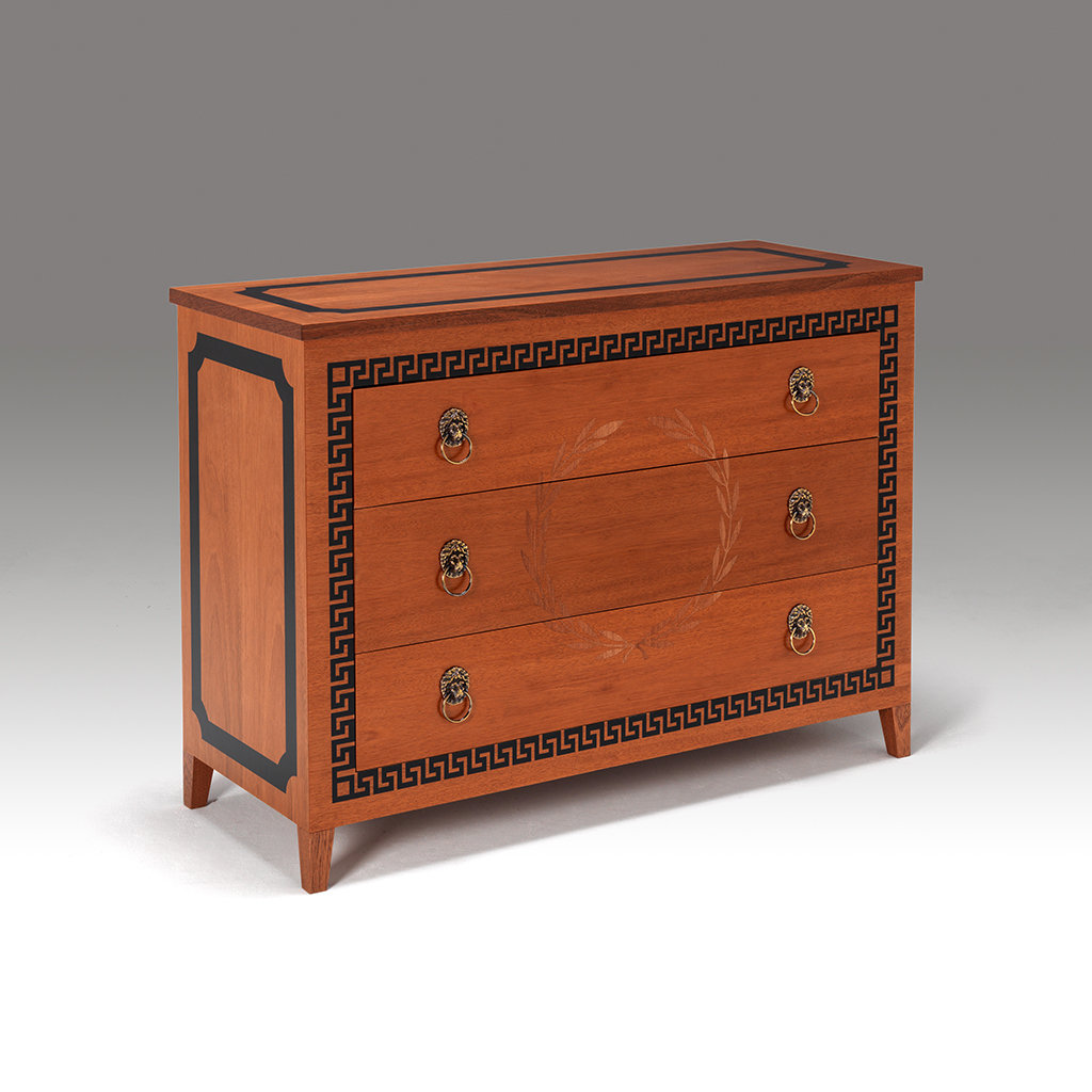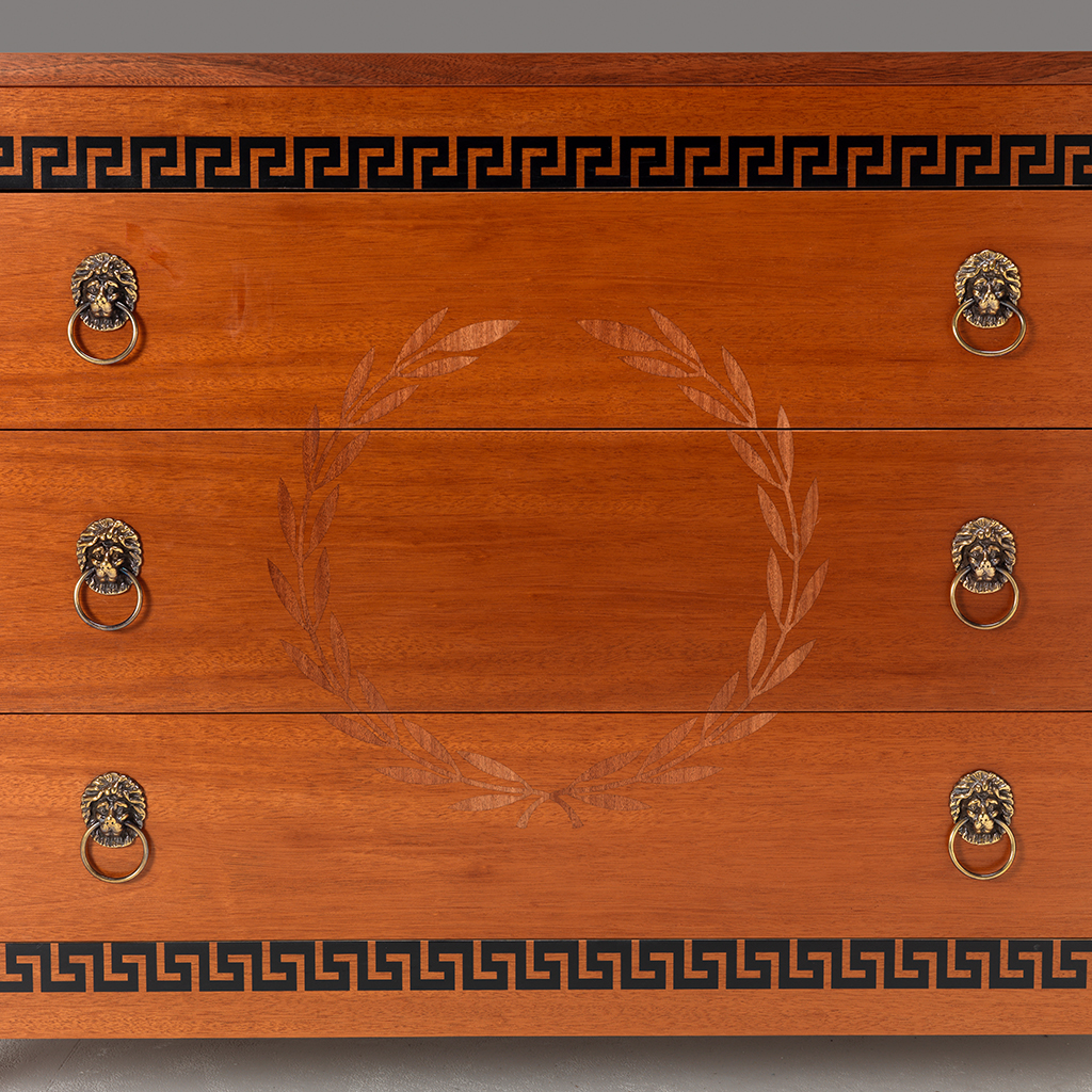 A fine three drawer commode. This commode with an inlaid Greek key detail to the front and a laurel wreath design to the centre. The drawers with lion design handles. Both the top and sides with an inlaid black border. The whole commode resting on four tapering legs.